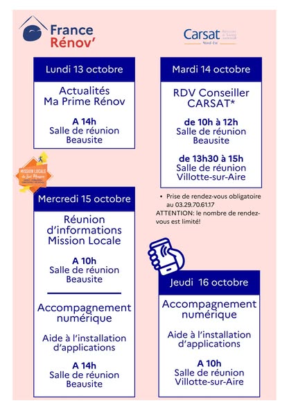 - Mardi 14 octobre de 10h à 15h : Rendez-vous individuel avec un agent de la CARSAT