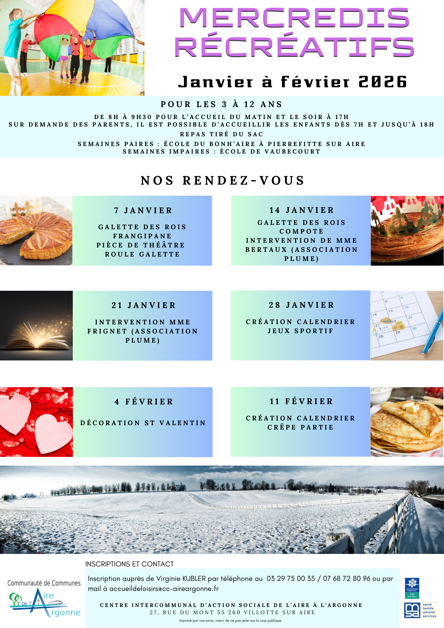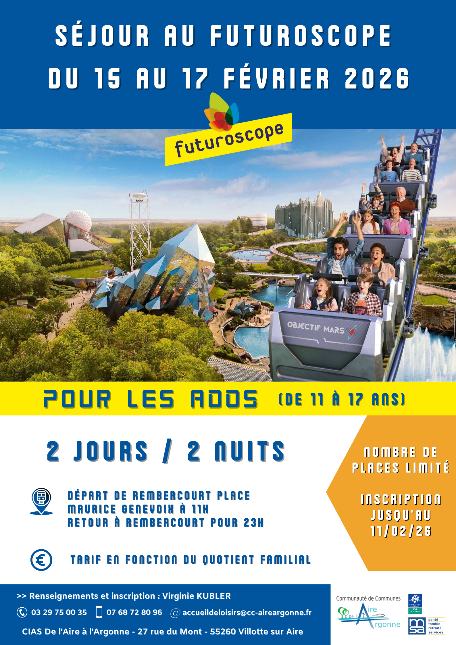 L'inscription se fait auprès de Virginie Kubler au 03 29 75 00 35 / 07 68 72 80 96 ou par mail accueildeloisirs@cc-aireargonne.fr.